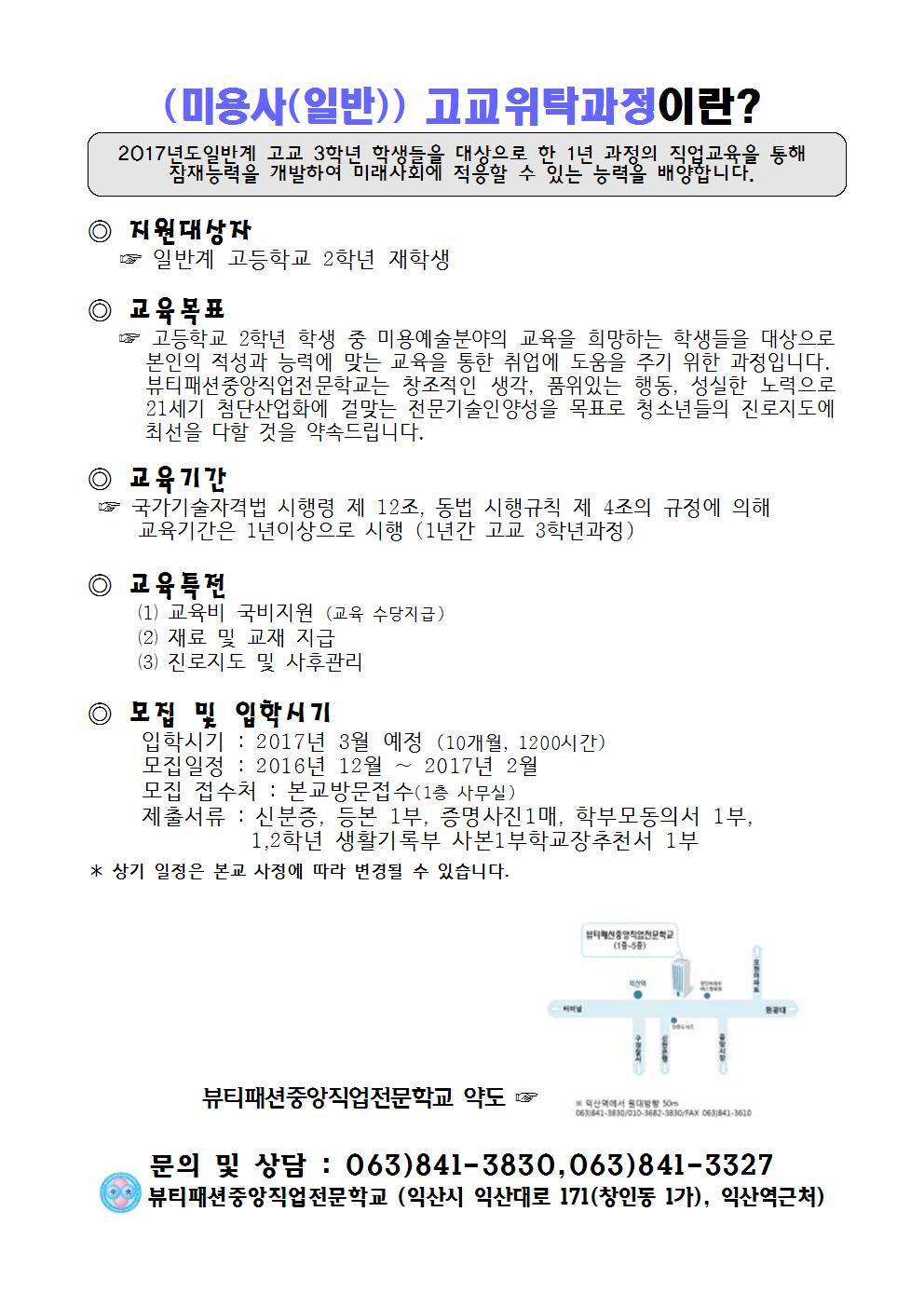 뷰티패션중앙직업전문학교가 '2017년도 일반고 특화과정 미용사(일반)'위탁과정에 선정되었습니다 ! 일반고 특화과정이란 일반계고등학교 3학년 학생들을 대상으로 한 1년과정의 직업교육을 통해 잠재능력을 개발하며 미래사회에 적응할 수 있는 능력을 배양하며 나아가 인재를 양성할 수 있는 훈련과정입니다.